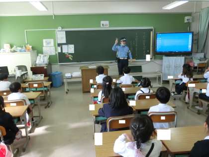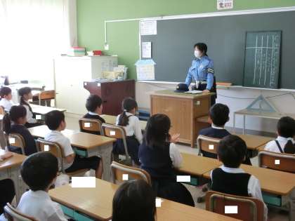 今朝は、西堺警察署の警察官にお越しいただき、1年生に登下校の安全についてのお話がありました。交通安全のルールをしっかり守る大切さを教えていただきました。教えていただいたことを守り、安全に気をつけましょう。