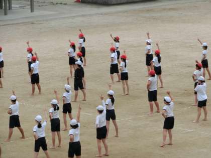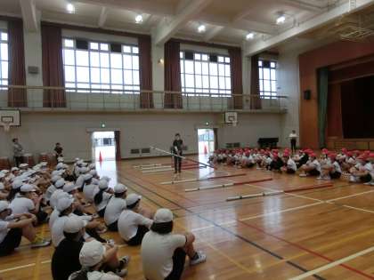 1時間目は、小雨模様となったので、体育館で「棒引き」の説明を聞いていました。久しぶりの団体競技「棒引き」です。どのような競技なのか、注意することは何か等先生の話をしっかりと聞いていました。