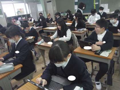 1組は新しい年を迎え、自分の目標を絵馬プリントに書いていました。気持ち新たに、また中学校へ向けて頑張ることを意識することは大切なことですね。2組はタブレットを使って冬休みの思い出をまとめていました。