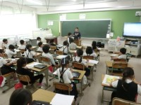 1時間めの国語の授業の様子です。グループで迷子の放送を考え、発表者の話をメモを...