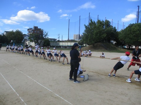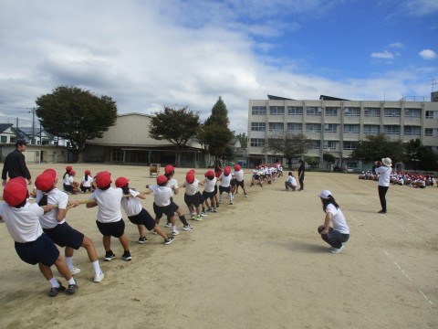 浜寺小学校の6年生が本校のグランドに来てくれて、綱引きの練習を合同で行いました。