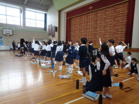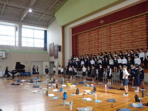 5年生は、体育館で学年で音楽の授業でした。保護者の方もたくさん来られて、緊張していますね。