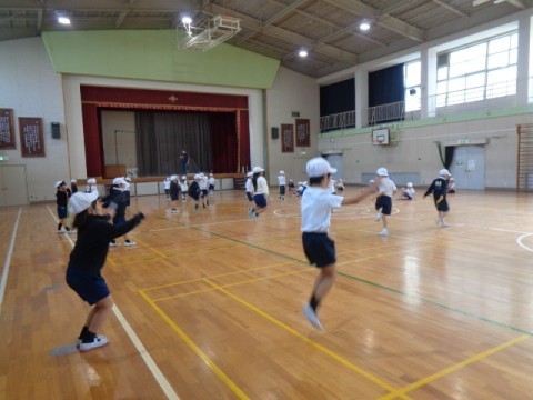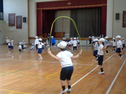 1年生の体育は、体育館で合同体育でした。1組も2組も上手に飛べるよう、練習しています。