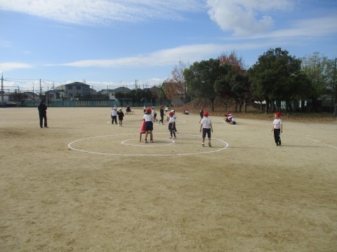 1年1組は体育でコーンを的にして,ボールを使ってチームであてるゲームをしていました。