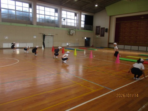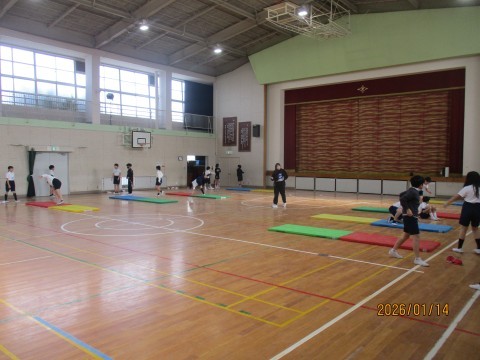5年生は体育の授業で「マット運動」に取り組んでいました。ウォーミングアップをしたのち,側転などのマット運動の練習をしていました。