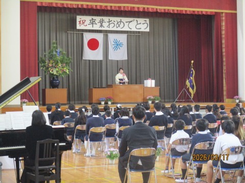 春のやわらかな日差しに包まれた、本校体育館にて卒業証書授与式を行いました。式では、担任の先生から名前を呼ばれると、一人一人が大きな声で返事をし、校長先生から卒業証書を受け取りました。少し緊張した表情の中にも、成長した自信と誇りが感じられる立派な姿でした。