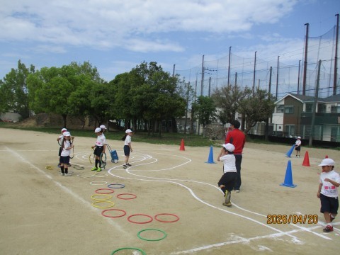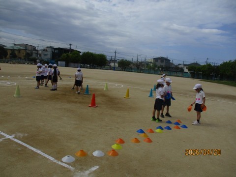 4月20日 2年生 体育の時間 公開日 2026/04/20 更新日 2026/04/20 2年生 2年生は体育の時間に、自分たちでコースを考え、それをクリアできるか挑戦していました。白線でジグザクを書いたり、コーンを並べたり、フラフープを置いたりして楽しそうに活動していました。