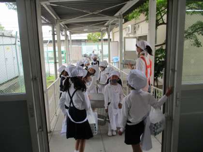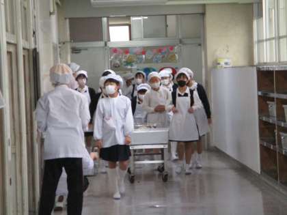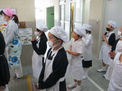 今日から給食が始まりました。 新しい学級で,給食の決まりを守って,当番をしています。