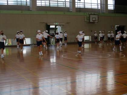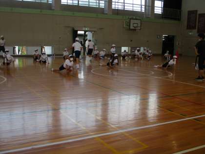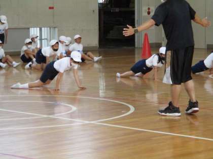 2組は体育館で,ジャンプしたり,腕立てで前進したり,