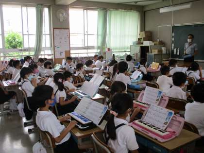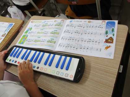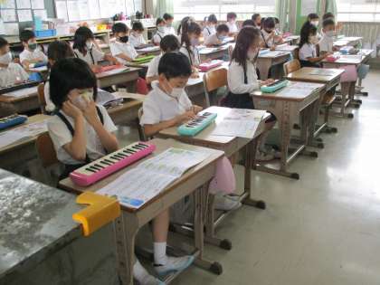 1組は鍵盤ハーモニカの練習をしています。