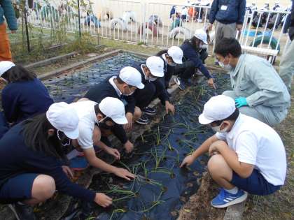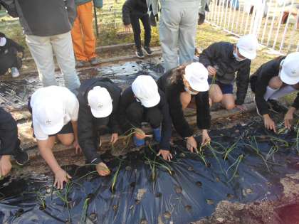 給食協会や役所の人などが来校し,たまねぎの苗をいただきました。