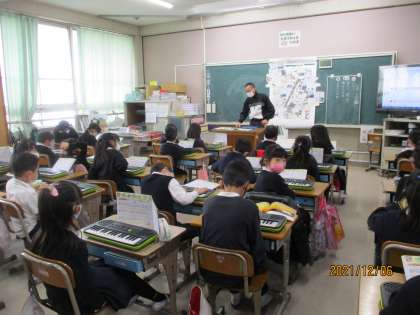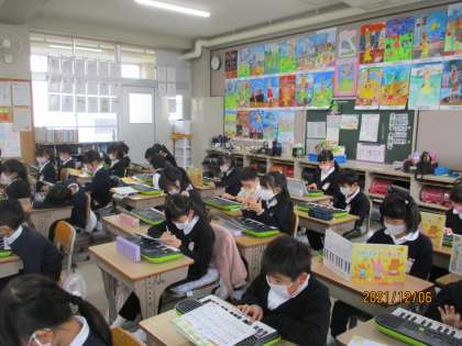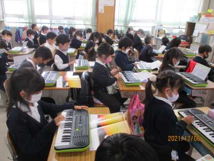 ミニ電子ピアノを使って,けんばんの指の練習をしています。
