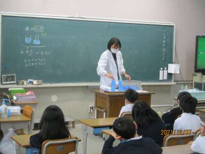 色水を,形のちがう容器に入れて,水の量がどちらが多いか予想をたてています。