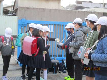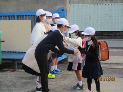 登校してきた子どもたちは,両脇に並んだ,児童会役員のあいさつを受けながら,校舎へと入っていきます。