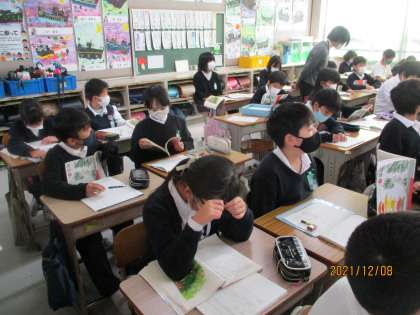 「このことが書かれていたらOK」と発表してくれた言葉を確かめながら,物語を読み取っています。