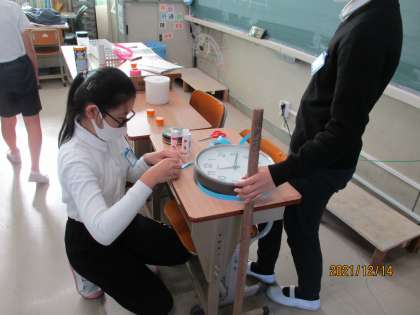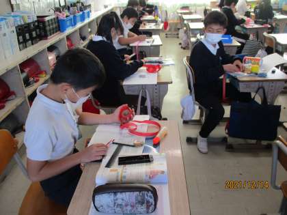 いろいろな丸い形をした物の円周をテープを使って測り,直径の何倍になっているかを調べています。