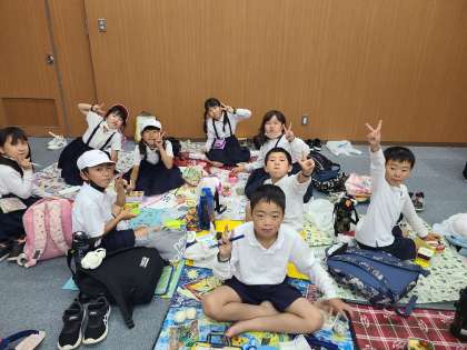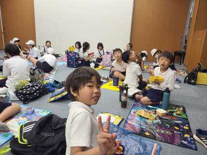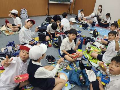 お待ちかねのお弁当タイムです。博物館のお部屋を借りて、みんなそろって…いただきます!