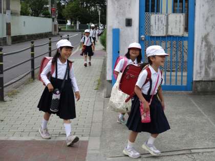 右から左から、登校してきて、友だちの顔を見るなり、満面の笑顔になって、一緒に校舎へと入っていきます。