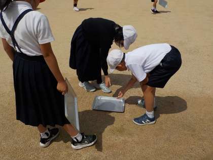 実際に運動場に出て、傾きについて実験しました。