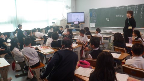 2年生は、「あいうえお」それぞれを頭文字にした作文をつくり,発表しあってました。友達の発表を興味をもって聞いていました。