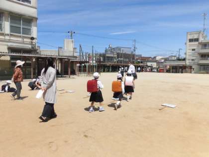 1年生は,学校生活のための学習を少しずつはじめていますが,下校の時も地区別にわかれ,教職員が付き添って下校の練習をしています。