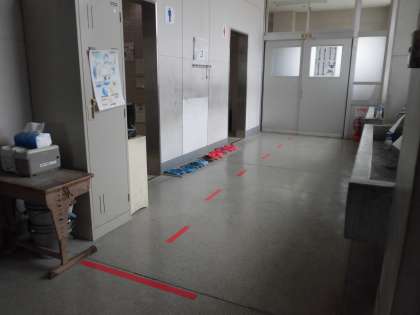 学校でも,机等の消毒以外にも,さまざまな安全のための対策をしています。手洗い場やトイレなどで,隣同士の蛇口を使用しないようにしたり,並ぶ時の目安になる線を引いたりしながら,密にならない工夫をしています。