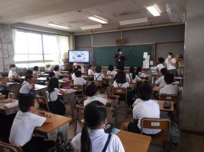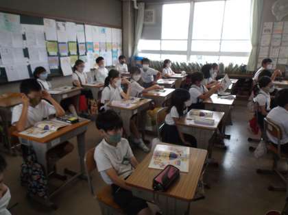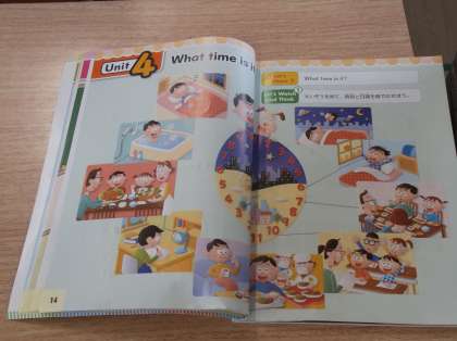 その後、「What time is it?」の発音を行い、答え方の練習をしていました。