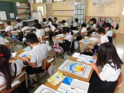 3組は図工で,絵の具を使っての学習です。パレットや筆の使い方を習った後,青色と赤色を混ぜて新しい色を作りました。青に近い紫や赤紫,いろいろな紫ができました。