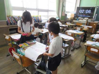 2年生は1年生に学校案内をします。理科室や音楽室など,学校の中のいろいろな場所の紹介ポスターを作成し,案内の練習をしています。