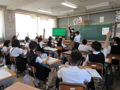 2組は外国語です。2学期にはどんなことを学習するのでしょうか。先生からの説明を集中して聞いています。この時間は,自分の夏の思い出についてどんな英語で表現すればいいのか考えています。