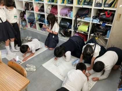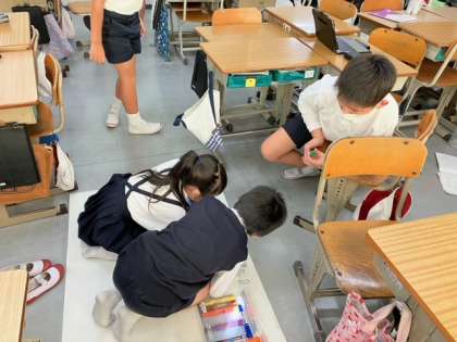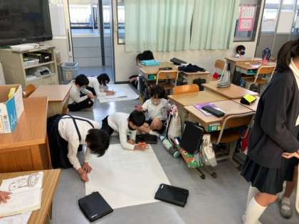 模造紙に、福祉のことについて調べた事をまとめていました。丁寧に協力しながら進められていました!