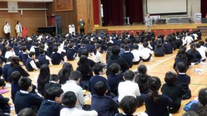 体育館で全員に話をしてもらいました。校内で気を付けることの他に、学校の外で声をかけられた時にすることなどについても教えてもらいました。