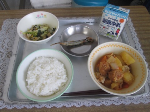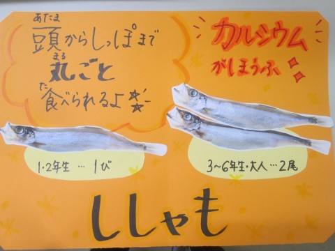 〇豚肉と野菜のしょうが煮 〇焼きシシャモ 〇小松菜と白菜の炒め煮 でした。