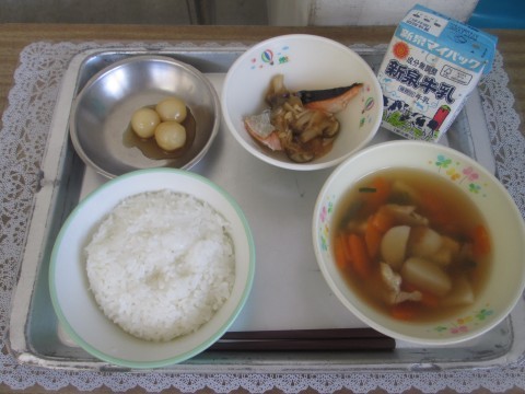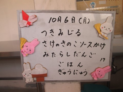 今日の給食は、満月に見立てたみたらしだんごでした。中秋の名月は里芋やさつまいもの収穫時期であることから、「芋名月(いもめいげつ)」とも呼ばれています。月見汁には里芋が入っていましたね。