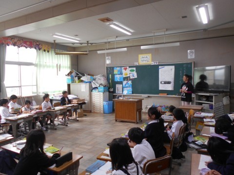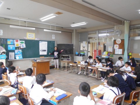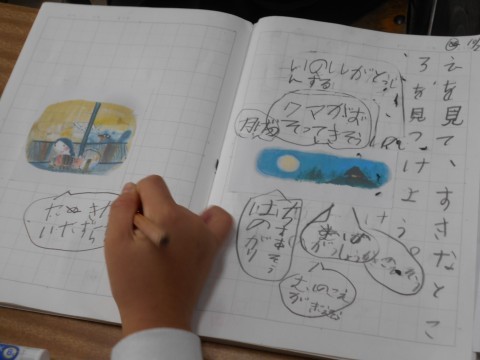 国語の授業です。「たぬきの糸車」の挿絵から,感じたことや思ったことを書いています。