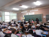 総合的な学習の時間です。身の回りにある「誰もが使いやすくしている工夫」について,話し合っています。