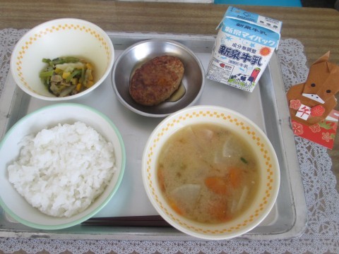 ○さつま汁 ○照り焼きハンバーグ ○小松菜と白菜の炒め煮 でした。