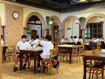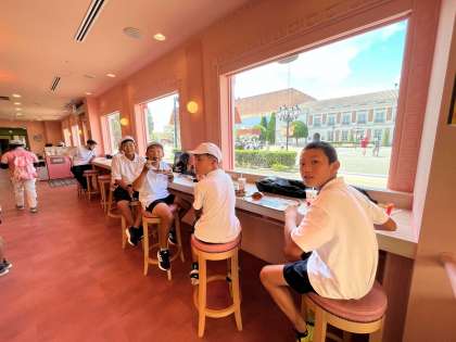 それぞれ、いろいろなレストランで昼食タイムです。クーポンを使って、自分たちで注文しています。