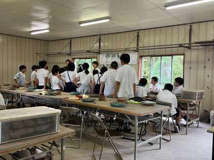 宗陶苑で、焼き物の作り方の説明を受けています。