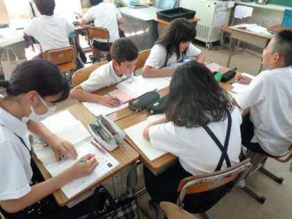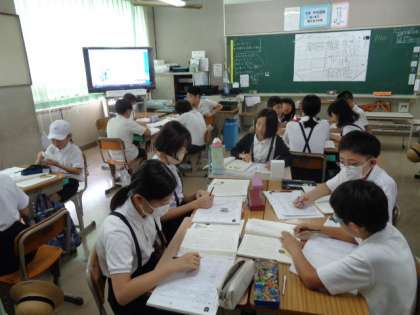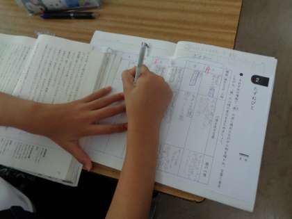 物語分の学習をしています。 文章を全体でとらえて登場人物の心情の変化を班で協力して話し合って考えました。