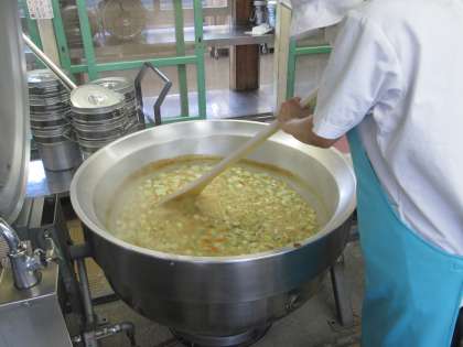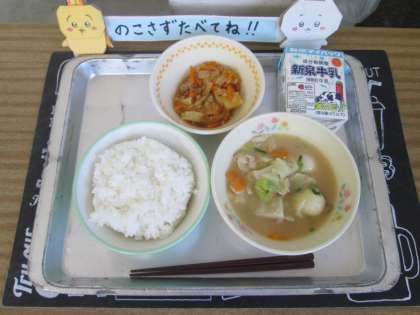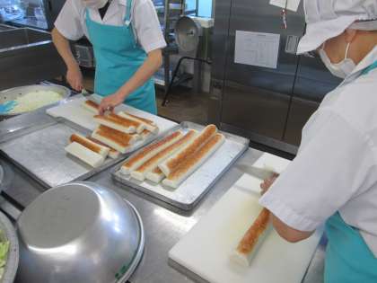 15日の給食 公開日 2023/09/15 更新日 2023/09/15 給食 今日の献立は, ごはん・牛乳・だんご汁・揚げじゃがのそぼろかけ でした。 だんご汁には,豚肉・キャベツ・青ネギ・にんじん・焼かまぼこ・だんごが入っています。 写真はかまぼこを切っている様子です。給食で使うかまぼこはスーパーで売っているものよりもサイズが長いです。子どもたちに写真を見せるとおっきい!と驚いていました(^^)