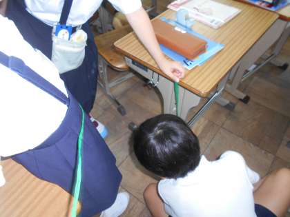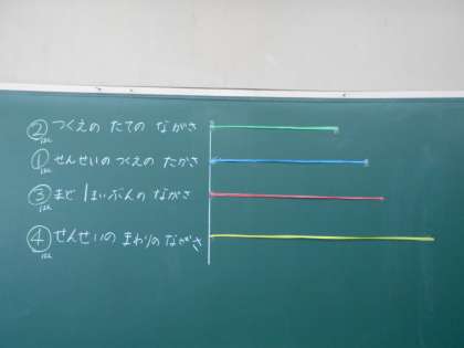 算数「どちらがながい」で、ひもを使いグループで長さをはかりました。意外な結果にびっくりしました。