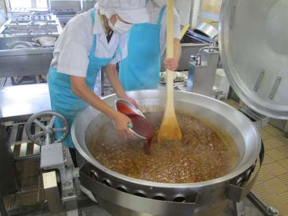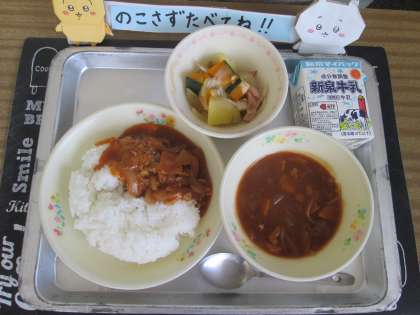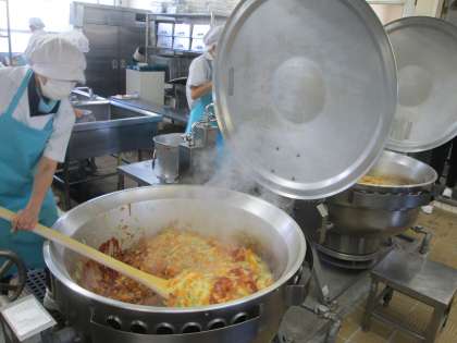 25日の給食 公開日 2023/09/25 更新日 2023/09/25 給食 今日の献立は ハヤシライス・牛乳・かぼちゃとポテトのサラダ でした。 給食のハヤシライスは,たまねぎがたっぷり入っています。 たまねぎをしっかり炒めて甘みを出して,大きな釜でルウとともにぐつぐつと焦げないようにじっくりと煮込みます。 子どもたちは,できたてのハヤシライスをおいしそうに食べていました(^^)
