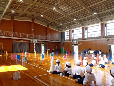 体育館にいろいろな障害物を置いて跳び越します。いろいろなコースに挑戦しました。