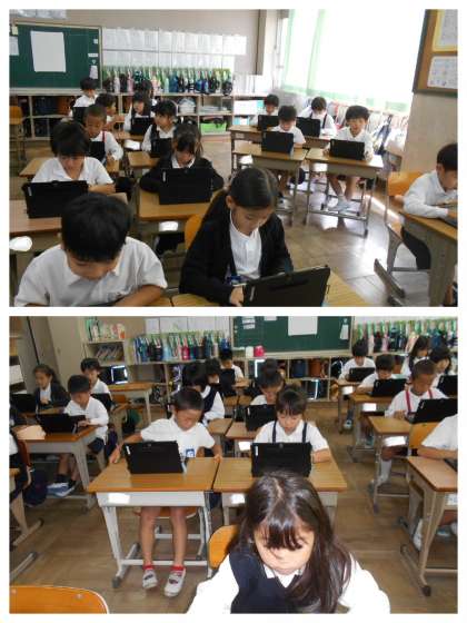 朝学の時間に、給食の先生が読み聞かせをしてくださいました。その後、昨日教えてもらった、タイピングの練習をタブレットでしました。