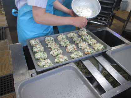 調理員さんが、こころを込めて、たくさんの野菜を切って、小松菜入りのお好み役を作ってくださいました。