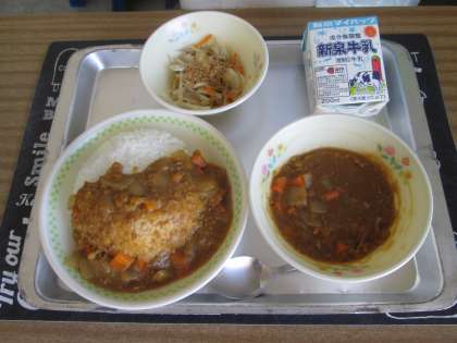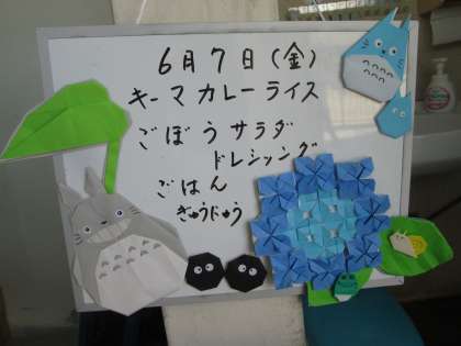 6月7日(金) 給食 公開日 2024/06/07 更新日 2024/06/07 給食 ごはん キーマカレーライス ごぼうサラダ 牛乳 キーマカレーとは、ミンチ肉などの細かい肉を使ったカレーを言います。 今日は、レンズ豆も入れています。 さすがカレー!! おかずはもちろん。ごはんもたっぷり食べてくれていました。 季節の飾りを、調理員さんは折り紙で作ってくれています。 6月は、アジサイです。 子どもたちは、毎月かわる飾りつけを、いつも楽しみにしていますね。