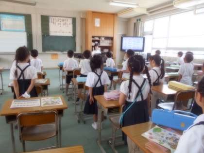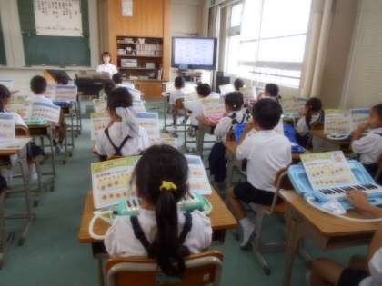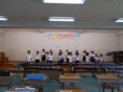 学校探検でみた音楽室で、授業を受けました。音楽の先生と一緒に歌をうたったり、鍵盤ハーモニカを演奏したりしました。とても、楽しかったです。