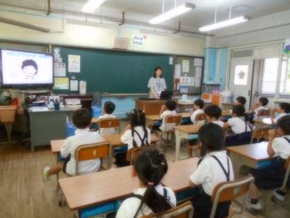 保健の先生にプライベートゾーンの話をしてもらいました。プールの前に大切な所や場所などを覚えました。