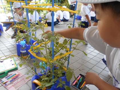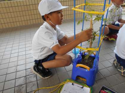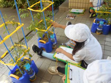 今まで育てている野菜がだんだん大きくなってきました。実がつき始めている子もいます。算数で長さの学習をしているので、30cmさしを使って、せの高さを測っている子もいました。